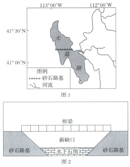 (2025·山东卷)美国大盐湖(图1)平均深度约4.3米,湖中只有卤虫等少数耐盐物种。研究表明,120‰~160‰的盐度可使大盐湖中卤虫种群维持较高的密度。20世纪初,湖上修建了一座跨湖木制铁路桥。该桥在1959年被一条新建的与其平行的砂石路基铁路取代。砂石路基将大盐湖分为北湾和南湾,并催生了两湾的特色产业——北湾的盐业和南湾的卤虫捕捞业。2013年,砂石路基仅有的两处4.6米宽的涵洞因老化被永久封闭。2016年,路基又被挖开一个55米宽的“新缺口”,并修建了桥梁和一道高度可调整的水下石坝(图2)。据此完成(1)~(3)题。