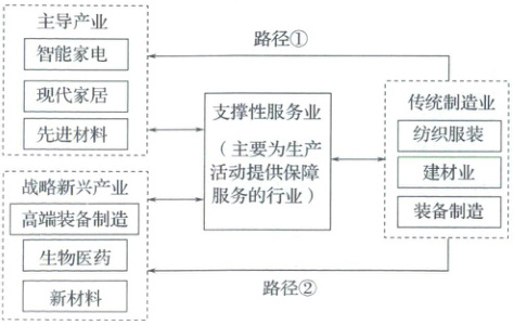3.A 4.D 第3题,科技咨询能够为传统制造业、战略新兴产业等提供技术研发、创新策略等方面的专业建议,助力企业在生产活动中解决技术难题、提升生产效率,是为生产活动提供保障服务的重要组成部分,①正确;物流仓储可以确保原材料及时供应到生产企业,保障生产的连续性,同时,能妥善存储和高效运输产品成品,使产品顺利进入市场,对生产活动起到关键的保障作用,②正确;社会保障主要是为居民在养老、医疗、失业等方面提供基本生活保障,并非直接围绕生产活动展开服务,不属于支撑性服务业,③错误;餐饮服务主要满足人们的饮食需求,属于生活性服务业,而非为生产活动提供保障服务的行业,④错误。故选A。第4题,路径②是从传统制造业向高端装备制造、生物医药、新材料等战略新兴产业转型。新兴产业往往在研发、设备投入等方面成本较高,并非以降低生产成本为目的,A错误;路径②重点在于产业类型的更新换代,从传统产业转向新兴产业,并非强调产业集群内部上下游联系的加强,B错误;产业延伸通常是在原有产业基础上拓展产业链,而这里是从传统产业向全新的战略新兴产业转变,不是产业延伸,C错误;通过发展高端装备制造、生物医药、新材料等战略新兴产业,实现产业更新,这些新兴产业具有高科技含量、高附加值等特点,能显著提高产品的竞争力,D正确。故选D。
