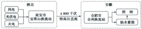 (2024·甘肃卷)2024年,陕北—安徽±800千伏特高压直流输电工程(陕电入皖工程)和安徽岳西抽水蓄能电站开工建设。陕电入皖工程是国家构建新型电力系统、建设新型能源体系的重点工程之一,要求电力资源输送中可再生能源电量占比不低于50%。岳西抽水蓄能电站为日调节纯抽水蓄能电站。下图示意陕皖相关工程概况。据此完成(1)~(3)题。