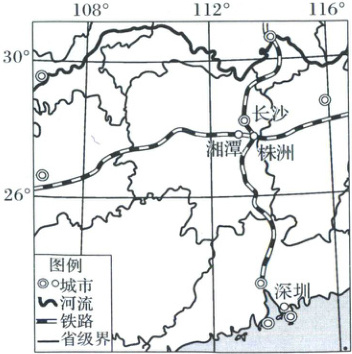 湘潭市是一座重要的钢铁工业城市。近年来该市积极转变发展思路,以“锰矿+锂云母”资源为基础,瞄准东部沿海地区新能源汽车及相关产业转移的机遇,通过“整车+电池+研发”全产业链布局,实施“链式承接”;同时与深圳高校共建异地联合实验室,将沿海地区研发成果在湘潭市孵化。下图示意湘潭市地理位置。