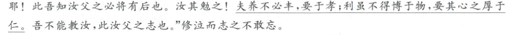。’其平居教他子弟,常用此语,吾耳熟焉,故能详也。其施于外事,吾不能知;其居于家,无所矜饰,而所为如此。是真发于中者耶!呜呼!其心厚于仁者(节选自欧阳修《泷冈阡表》②)