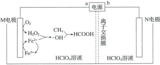 该装置外接电源,为电解池。M电极上O₂转化为H₂O₂、Fe³⁺转化为Fe²⁺,均是得电子,发生还原反应,故M电极为阴极,电极反应式为O₂ + 2e⁻ + 2H⁺ = H₂O₂、Fe³⁺ + e⁻ = Fe²⁺,A正确。N电极为阳极,发生失电子的氧化反应,电极反应式为2H₂O - 4e⁻ = O₂↑ + 4H⁺。由上述分析可知,M电极为阴极,N电极为阳极,阳极的电势高于阴极的电势,则N电极电势高于M电极电势,A正确。阴极区发生反应O₂ + 2e⁻ + 2H⁺ = H₂O₂、H⁺ + Fe²⁺ + H₂O₂ = Fe³⁺ + ·OH + H₂O,消耗H⁺,而阳极区产生H⁺,要维持电荷守恒,可以是阳极区的H⁺通过离子交换膜进入阴极区,即离子交换膜可以为阳离子交换膜,C正确。根据得失电子守恒可得关系式CH₃COOH ~ 6·OH ~ 6O₂,则若生成4.6gHCOOH(0.1molHCOOH),理论上消耗0.6molO₂,即标准状况下13.44LO₂,D错误。