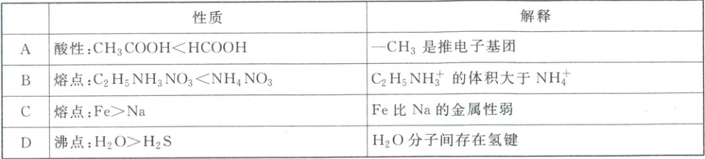 [解析] A.—CH₃是推电子基团,使乙酸中羟基的极性减弱,酸性弱于甲酸,A解释正确;B.C₂H₅NH₃⁺的体积大于NH₄⁺,导致其硝酸盐的晶格能较低、熔点更低,B解释正确;C.Fe熔点高于Na是因金属键更强,而不是因为Fe的金属性比钠弱,金属性是金属失电子的能力,与金属熔点无关,C解释错误;D.H₂O分子间氢键使其沸点反常高于H₂S,D解释正确;故选C。