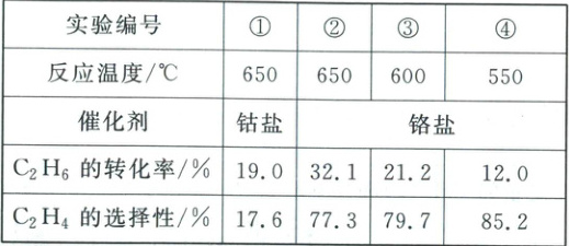 (2)已知C₂H₄选择性为转化的乙烷中生成乙烯的百分比。反应温度为650℃时,较优的催化剂为______(填“钴盐”或“铬盐”)。对比实验②③④可得出结论:______(从温度对C₂H₆的转化率和C₂H₄的选择性的影响角度分析)。