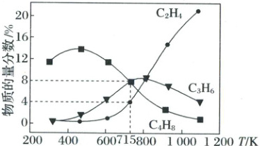 (5)其他条件不变,起始压强为0.1aMPa,向容积为1L的恒容密闭容器中投入1molCH₃I(g),只发生反应ⅰ、ⅱ、ⅲ,反应温度对平衡体系中乙烯、丙烯和丁烯的物质的量分数的影响如图。
