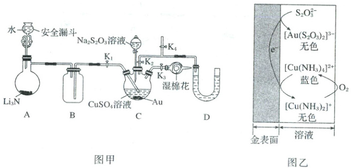 [解析] 装置A中氮化锂与水反应制取氨,B为安全瓶防止氨溶于C中溶液时出现倒吸,由图乙可知Na₂S₂O₃与Au反应生成 [Au(S₂O₃)₂]³⁻,铜离子变成 [Cu(NH₃)₄]²⁺,该离子与Au反应生成 [Cu(NH₃)₂]⁺,[Cu(NH₃)₂]⁺与氧气反应生成 [Cu(NH₃)₄]²⁺,通过该转化实现Au的浸取。
