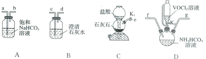 (2)① + 4价钒在弱酸性条件下具有还原性,因此在反应前需要除尽装置内的空气,先用C装置产生CO₂,生成的CO₂中混有HCl,故再将混合气体通过A除去CO₂中的HCl,然后连接D装置,最后g连接c,观察到澄清石灰水变浑浊说明装置内的空气已经排尽,故从左到右的连接顺序为eabfgc。③VOCl₂与NH₄HCO₃反应生成氧钒(Ⅳ)碱式碳酸铵晶体,反应后的溶液中含有氯离子,过滤后得到紫红色晶体,用饱和碳酸氢铵溶液洗涤除去晶体表面的氯离子,氯离子的电子式为 \begin{array}{c} \vdots \mathrm{Cl} \vdots \\ {-} \end{array}。