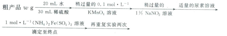 粗产品wg→20mL水、30mL稀硫酸→稍过量的0.1mol·L⁻¹KMnO₄溶液→稍过量的1%NaNO₂溶液→适量的尿素溶液→1mol·L⁻¹(NH₄)₂Fe(SO₄)₂溶液滴定至终点→再重复实验两次