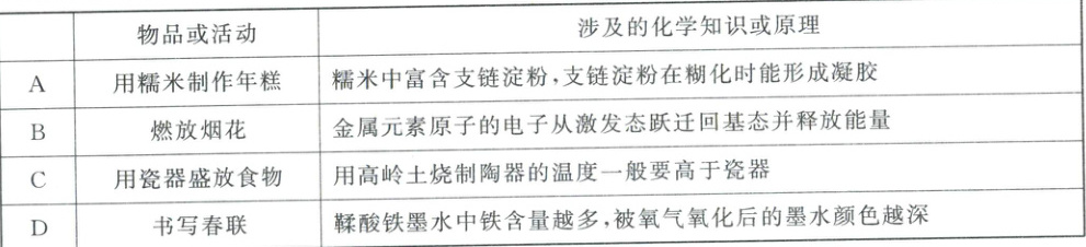 [解析] A.糯米年糕中含有支链淀粉,在糊化时能形成凝胶,故A正确;B.激发态能量大于基态,金属元素原子的电子从激发态跃迁回基态并释放能量,故B正确;C.陶器烧制的温度通常在950~1165℃之间,而瓷器的烧制温度一般都在1280~1400℃以上,因此瓷器需要的烧制温度比陶器高,故C错误;D.鞣酸亚铁中(Fe²⁺)被氧化为黑色沉淀鞣酸铁(Fe³⁺),铁含量直接影响最终产物的浓度,铁含量越大颜色越深,故D正确;故答案为C。