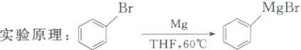 [分析] 在仪器 B 中加入 1.5g 打磨过的镁条和适量碘,通过双排管充入氮气,缓慢滴加溴苯(6.4mL,约 0.06mol)的四氢呋喃(THF)溶液,边滴边搅拌,加毕后缓懮升温至回流状态,待镁条的量不再变化后停止加热,反应生成