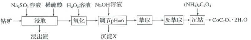 [分析] 加硫酸溶解后,氢氧化物及部分金属氧化物溶于硫酸,再加入 $Na_2SO_3$ 后,$MnO_2$ 和 $Co_2O_3$ 被还原成 $Mn^{2+}$ 和 $Co^{2+}$,$SiO_2$ 不与硫酸反应,经过滤除去;向滤液中加入 $H_2O_2$,$H_2O_2$ 将 $Fe^{2+}$ 氧化为 $Fe^{3+}$,然后加入 $NaOH$ 调节 $pH$ 值为 6,$Al^{3+}$、$Fe^{3+}$ 转化为氢氧化物沉淀而除去,滤液经萃取和反萃取后,加入 $(NH_4)_2C_2O_4$ 沉钴,得到 $CoC_2O_4 · 2H_2O$。