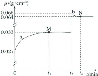 [解析] A.$M$点对应$t_1$时刻,此前气体密度$ρ$随时间增大,说明反应正向进行;$t_1~t_2$间$ρ$恒定,表明反应达到平衡,则$M$点体系已达平衡状态,A项正确;平衡时气体密度$ρ = 0.033g/cm^3$,容器体积$2L$,气体总质量$= 0.033g/cm^3×2000cm^3 = 66g$;初始气体质量为$3molH_2O$的质量为$54g$,气体质量增加$12g$,则消耗$1molH_2O$,平衡时$c(H_2O)=1mol/L$,$c(CO)=0.5mol/L$,$c(H_2)=0.5mol/L$,$K=\frac{0.5×0.5}{1}=0.25$,C项错误;用$C(s)$表示的平均反应速率为$\frac{1}{t_1}mol·min^{-1}$,B错误;D.$N$点为缩小体积后新平衡,气体质量$64g$,说明气体减少$2g$,对应逆向生成$\frac{1}{6}mol$的$C$,此时$c(H_2O)=\frac{13}{6}mol/L$,$c(CO)=\frac{5}{6}mol/L$,$c(H_2)=\frac{5}{6}mol/L$,充入$1molH_2O$和$1molH_2$,则$Q=\frac{\frac{5}{6}×\frac{11}{6}}{\frac{19}{6}}≈0.482>0.25$,平衡逆向移动,$v_逆>v_正$,D项错误;答案选A。