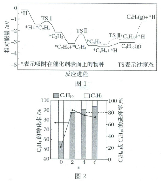 ①根据图1,写出生成$C_4H_{10}$的过程中决速步反应式_;$C_4H_{10}$的选择性大于$C_4H_8$的原因是_。