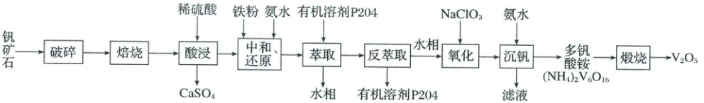 [分析] 钒矿石经破碎、焙烧后,固体中主要含有$Fe(VO_3)_2$、$Fe(VO_3)_3$、$Mn(VO_3)_2$、$Ca(VO_3)_2$;加稀硫酸酸浸,钙离子转化为$CaSO_4$,经过滤除去,滤液中钒以$VO_2^+$形式存在,加氨水和铁粉中和还原,该工序$pH$低于7.0,发生反应$4H^++Fe + 2VO^+=2VO^{2 +}+Fe^{2 +}+2H_2O$,铁离子和铁反应生成亚铁离子,过滤除去过量的$Fe$,所得滤液经有机溶剂萃取、反萃取后,$VO^{2 +}$进入水相,加$NaClO_3$氧化将$VO^{2 +}$转化为$VO_2^+$,加氨水沉钒,生成的多钒酸铵煅烧生成$V_2O_5$。
