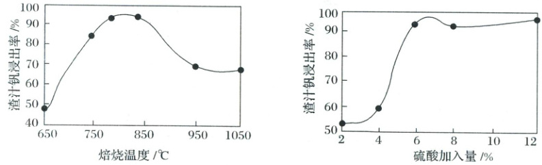 (2)温度:$820℃$左右($800℃~830℃$之间均可);硫酸加入量:6%(6%~6.5%之间均可) 降低多钒酸铵的溶解度,减少损失