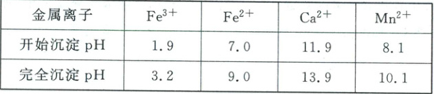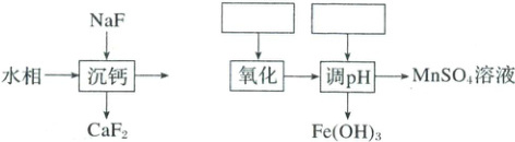 (4)“萃取”分离后,所得“水相”中的金属离子有$Mn^{2 +}$、$Fe^{2 +}$和少量的$Ca^{2 +}$,欲得到$MnSO_4$溶液,需除去杂质$Ca^{2 +}$、$Fe^{2 +}$,第一道工序已经除去$Ca^{2 +}$,说明后续工序应除去$Fe^{2 +}$;又结合各金属离子开始沉淀和完全沉淀的pH,可知需将$Fe^{2 +}$氧化为$Fe^{3 +}$,为了不引入杂质离子,氧化剂可选择$H_2O_2$溶液,再调溶液的pH,使$Fe^{3 +}$转变成$Fe(OH)_3$沉淀,为了不引入杂质离子,利用$MnO$调pH,所以补充完整的流程图为: