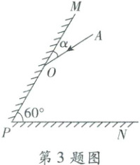 3. 如图所示,两块平面镜相交夹角为60°,一束光线沿AO斜射到平面镜MP上,光线经两平面镜反射后与AO重合,但方向相反,则AO与平面镜MP的夹角α的大小是____。