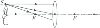11. 如图所示,请画出光源 $ S $ 发出的三条光线通过凸透镜后的折射光线。