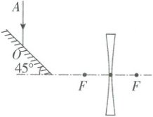 12. 如图所示,凹透镜的主光轴处于水平位置,$ F $ 是其焦点,平面镜与水平方向成 $ 45^{\circ} $,请画出竖直激光束 $ AO $ 经平面镜反射,再经凹透镜折射的光路图。