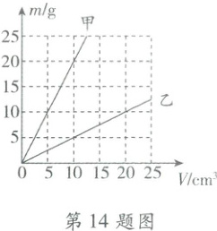 14. (双选)如图所示是甲、乙两种物质的质量与体积关系图像,分析图像可知 (