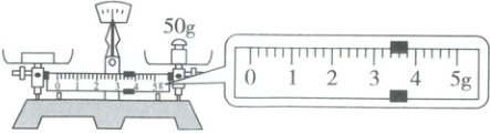 4. 小刚想测薄厚均匀的长方体铜片的厚度, 他从物质密度表中查出铜的密度是 8.9g/cm³, 这个密度值表示的物理意义是______。然后, 他用天平测量铜片的质量, 天平平衡后, 右盘所放砝码及游码位置如图所示, 则铜片质量为______g。之后, 他又用刻度尺测出这片铜片的长和宽, 分别是 20cm、5cm, 运用这些数据, 可计算铜片厚度为______cm。