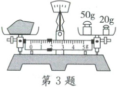 3. 小明同学用调节好的托盘天平测小石块的质量, 天平平衡时盘中所加砝码情况和游码位置如图所示, 则被测小石块的质量为