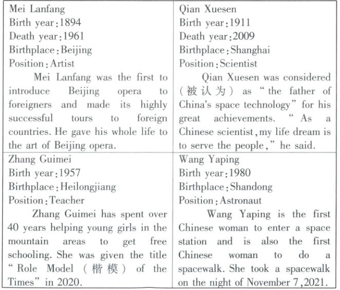 )24. What is Wang Yaping’s birthplace?A. Beijing. B. Shanghai. C. Shandong. D. Heilongjiang.
