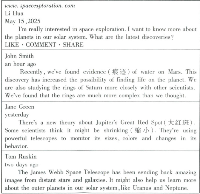 21.B【解析】根据“I’m really interested in space exploration.”可知,李华对宇宙探索感兴趣。故选B。