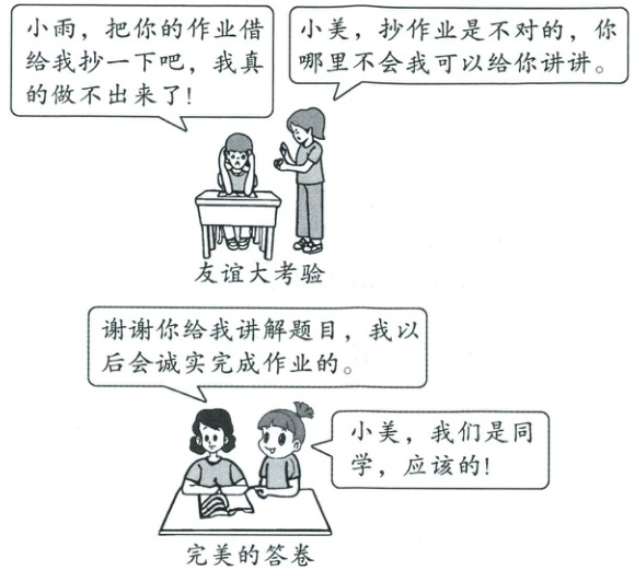 (2) 结合上述两幅漫画,请你从诚信的角度对小美完成作业的整个过程进行点评。(3分)