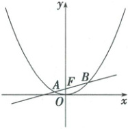 12. (15 分)(2025·四川省成都市三模)如图,在直角坐标系 $ xOy $ 中,已知 $ F $ 是抛物线 $ \Gamma:x^2 = 2py(p > 0) $ 的焦点,过点 $ F $ 的直线交抛物线 $ \Gamma $ 于 $ A $,$ B $ 两点,且满足 $ \overrightarrow{OA} · \overrightarrow{OB} = -3 $。