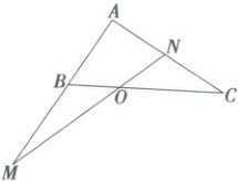 所以,$\overrightarrow{AO} = \frac{2}{3}\overrightarrow{AB} + \frac{1}{3}\overrightarrow{AC}$,又因为$\overrightarrow{AB} = m\overrightarrow{AM},\overrightarrow{AC} = n\overrightarrow{AN}$,则$\overrightarrow{AO} = \frac{2}{3}m\overrightarrow{AM} + \frac{1}{3}n\overrightarrow{AN}$,因为$M,N,O$三点共线,设$\overrightarrow{MO} = k\overrightarrow{MN}$,则$\overrightarrow{AO} - \overrightarrow{AM} = k(\overrightarrow{AN} - \overrightarrow{AM})$,所以,$\overrightarrow{AO} = (1 - k)\overrightarrow{AM} + k\overrightarrow{AN}$,且$\overrightarrow{AM},\overrightarrow{AN}$不共线,