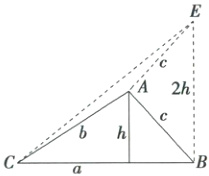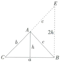 如图,在$\triangle ABC$中,过$B$作$CB$的垂线$EB$,且使$EB = 2h$,则$AE = AB = c$。