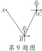 9. 如图,一艘轮船由海平面上 $ C $ 地出发向南偏西 $ 25^{\circ} $ 方向行驶 $ 50 $ 海里到达 $ B $ 地,再由 $ B $ 地向北偏西 $ 35^{\circ} $ 方向行驶 $ 50 $ 海里到达 $ A $ 地,则 $ A $,$ C $ 两地相距