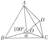 ∴$\angle AOD = 360^{\circ} - 100^{\circ} - 60^{\circ} - \alpha = 200^{\circ} - \alpha$,$\angle ADO = \alpha - 60^{\circ}$,