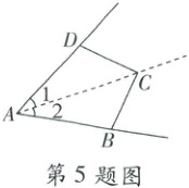 5. 如图,四边形(四边都在同一平面内)框架是一个作角平分线的简易工具,其中 $ AD = AB $,$ CD = CB $,将点 $ A $ 移至某角的顶点处,再使 $ AD $ 和 $ AB $ 张大到与这个角的两边分别重合时,连接 $ AC $,射线 $ AC $ 即是该角的平分线。它的原理是利用 $ \triangle ADC \cong \triangle ABC $,得到 $ \angle 1 = \angle 2 $,从而证明 $ AC $ 是角平分线,那么判定三角形全等的依据是(