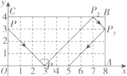 10. 小静同学观察台球比赛,从中受到启发,抽象成数学问题如下:如图,已知长方形$OABC$,小球$P$从$(0,3)$出发,沿如图所示的方向运动,每当碰到长方形的边时反弹,反弹时反射角等于入射角,第一次碰到长方形的边时的位置为$P_{1}(3,0)$,当小球$P$第2026次碰到长方形的边时,若不考虑阻力,点$P_{2026}$的坐标是 (