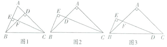 (3) $\triangle ABC$中,$AB = AC,\angle A = 90^{\circ}$,如图3,点$D$在线段$BC$上,$BE\perp ED$于点$E$,$DE$交$AB$于点$F$,且$\angle ABE=\angle EDB$,请直接写出$BE$和$DF$的数量关系.