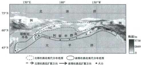 (1)根据图示信息可知,北部杜鹃花分布区位于极圈附近,纬度高,热量少,且易受极地东风的影响,故气候寒冷,风力大,虽然勘察加杜鹃花属喜寒植物,但极端寒冷会对其造成伤害,所以匍匐贴地生长有利于保温,同时减少大风的破坏,增强抗风能力。
