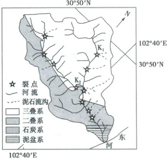 (2)根据材料其形成主要受河流的溯源侵蚀、河床的构造抬升、岩性差异和堆积体堵塞河道等影响。读图 K₁ 位于泥石流沟与河流交汇处,历史上泥石流发生时,泥沙和石块在河流