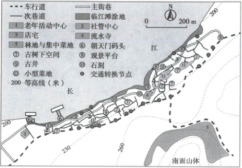 5.D 6.B 5.从图中可以看出①-⑩都是适老空间,所以适老空间形式多样,A错误;林地、菜地、古树下、沿江滩涂都是适合乡村老年人生活生产的场所,山水要素突出,B错误;图中显示除了老年活动中心,其他适老空间都规模小而且零星分散分布,C错误;乡村适老空间不像城市,有专门的娱乐休闲与生产活动场所,功能分区明确,图中的菜地、林地、码头等都既是乡村老年人休闲生活场所,也是生产活动的场所,所以功能划分不明确,D正确。 6.从图中可看出,主街巷道基本沿江沿等高线分布,所以坡度小,②错误;临江滩涂距离是指从村子各院宅到临江滩涂的距离,利用比例尺可估算基本在100米以内,不远,③错误;题干说明村落临江依山而建,许多次巷道与江岸垂直,由比例尺与等高线估算出村落高差70米左右,地势陡峻,①正确;题干说明村落临江依山而建、房屋密集,所以宅前院后空间小,④正确。 故选B。