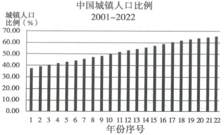 (2025·江西省重点中学协作体联考·一模)2022年7月,国家发改委发布《“十四五”新型城镇化实施方案》,方案明确“十四五”时期深入推进以人为核心的新型城镇化战略的目标任务和政策举措。其中包括“推进城乡融合发展”,即坚持以工补农、以城带乡,以县域为基本单元、以国家城乡融合发展试验区为突破口,促进城乡要素自由流动和公共资源合理配置,逐步健全城乡融合发展体制机制和政策体系。如图为我国2001—2022年城镇人口占总人口比例变化。据此完成下面小题。
