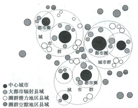 (2025·湖南省部分学校·一模)【新情境·县域空间体系】近年来,以中心城市为组织核心的都市圈和城市群日益成为城镇化的主体形态。有学者将县域作为研究对象,将县域划分为大都市辐射县域、圈群潜力地区县域、圈群空隙地区县域3种类型。如图示意圈群组织视角下的县域空间体系。据此完成下面小题。