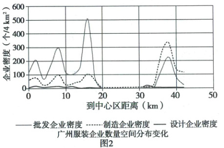 (3)分布特征:从图2“广州服装企业数量空间分布变化”图中可以看出,批发、制造企业的密度高峰大致相同,都在与中心区一定距离处出现峰值,这体现了两者在空间分布上的相似性。有利影响:不同生产环节的再集聚,使得企业在空间上相对集中。企业间可共享当地的基础设施和服务设施,从而降低单个企业的建设和运营成本。企业集聚促进了企业之间的信息交流和技术协作。服装企业能及时分享市场流行趋势、服装设计新元素、生产工艺改进等信息,更好地实现“生产柔性化”,满足市场多样化需求。企业在空间上的合理布局,使得产品运输距离相对缩短,可节省产品运输成本,降低企业间的物流流通成本。各产业环节在一定区域内集聚,能实现高效对接,进行产业协同。