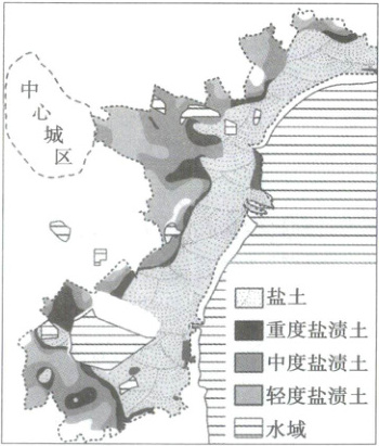 7. 天津滨海新区土地盐渍化程度空间总体分布特征是(