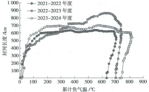 黄河宁蒙河段是黄河宁夏河段和内蒙古河段的统称,位于黄河最北端,冬季封河长度变化较大。研究人员统计了黄河宁蒙段2021—2024年的封河长度变化,并且建立了封河长度与累计负气温(包头水文站气温数据)之间的对应关系(如图),将该河段的封河长度变化过程大致分为封河期的快速增长阶段、稳封期的平稳阶段和开河期的快速减少阶段。据此完成下面小题。