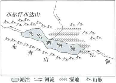 冬给措纳湖是青藏高原东北部的一个大型淡水湖,该区域年降水量约为300mm,年蒸发量约为1000mm。冬给措纳湖东北部拥有一大片湿地嵩草滩,嵩草喜湿怕旱。如图示意冬给措纳湖水系。据此完成下面小题。