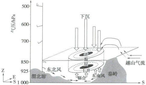 (2025·浙江台州·一模)2018年1月11~28日,我国关中盆地经历了一次持续时间长、范围广的重度污染天气事件。这期间受山谷风等影响,PM2.5峰值在每天午后和前半夜出现。如图为该污染事件的形成机理示意图。据此完成下面小题。