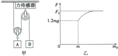 6. (2025·重庆市巴蜀中学模拟)(多选)如图甲所示,轻质动滑轮下方悬挂重物A,轻质定滑轮悬挂在一个力传感器的正下方,在轻质定滑轮下方悬挂重物B,悬挂滑轮的轻质细线竖直。开始时,重物A、B均处于静止状态,A质量为m,静止释放B后A、B开始运动。初始两滑轮之间竖直距离足够大,运动过程中各物体不会互相碰撞。假设摩擦阻力和空气阻力均忽略不计,重力加速度为g。保持A物体质量m不变,使B物体质量从m增大,通过计算机描绘得到传感器对定滑轮的拉力F随B物体质量m_B变化关系曲线如图乙所示,F=F₀直线是曲线的渐近线(F₀的值可用m、g表示)。下列说法正确的是(