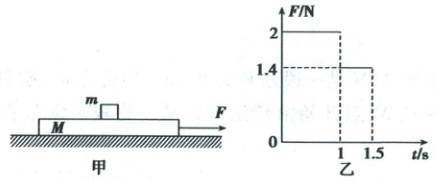 9. (2025·辽宁省大连市联考)如图甲所示,一质量为M=0.2kg的木板静止在水平面上,一个质量为m=0.1kg的物块(视为质点)放置在木板上表面的中点位置。t=0时刻,用水平向右的拉力F作用在木板上,拉力F随时间t的变化关系如图乙所示,t=1.5s时撤去外力作用。物块与木板之间的动摩擦因数μ₁=0.2,木板与水平面之间的动摩擦因数μ₂=0.4,设最大静摩擦力等于滑动摩擦力,且物块始终未离开木板,重力加速度取g=10m/s²。求: