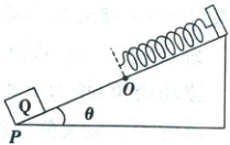 7. (2025·云南卷)(多选)如图所示,倾角为$\theta$的固定斜面,其顶端固定一劲度系数为$k$的轻质弹簧,弹簧处于原长时下端位于$O$点。质量为$m$的滑块$Q$(视为质点)与斜面间的动摩擦因数$\mu=\tan\theta$。过程Ⅰ:$Q$以速度$v_{0}$从斜面底端$P$点沿斜面向上运动恰好能滑至$O$点;过程Ⅱ:将$Q$连接在弹簧的下端并拉至$P$点由静止释放,$Q$通过$M$点(图中未画出)时速度最大,过$O$点后能继续上滑。弹簧始终在弹性限度内,假设最大静摩擦力等于滑动摩擦力,忽略空气阻力,重力加速度为$g$。则